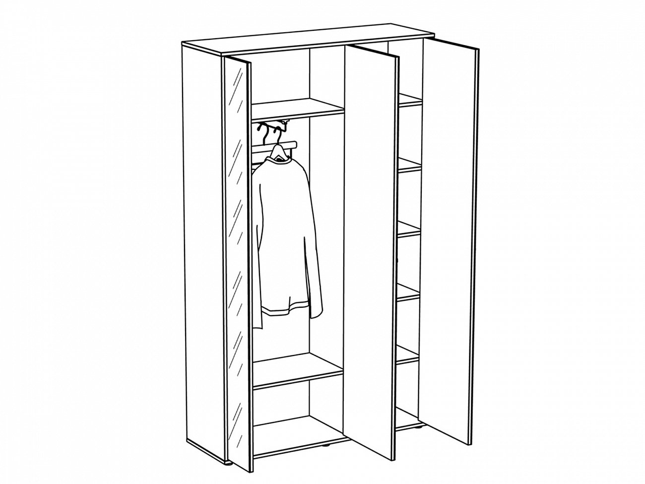 Шкаф трехдверный. Шкаф стостоит из двух отделений. В большом отделении за двумя распашными дверцами расположены выдвижная штанга для одежды и две полки. В правом отделении расположены 5 полок. Шкаф крепится к стене.